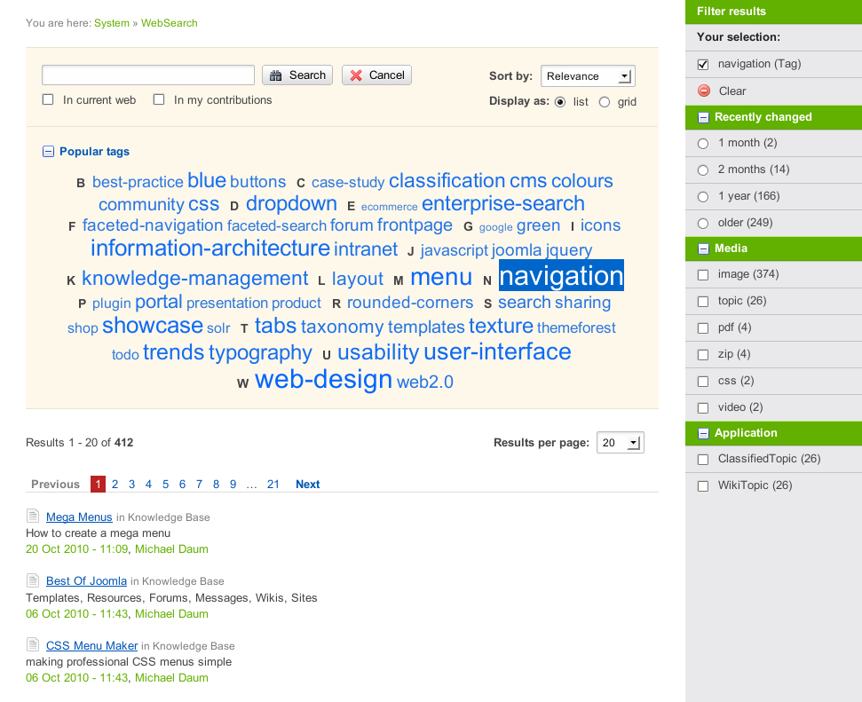 performance improvements of indexer; implemented instant search; new crawler interface to index not only wiki content but also external sources; new filesystem crawler; eased configuring the search interface with preference variables; extended solr schema to cope with multiple data sources; improved handling of substring searches in text fields; require validation and authentication in rest handlers; removed hardcoded WorkflowPlugin support (plugins need to hook into the indexing api instead); added support for formfields of type number, percent, currency and bytes; improved indexing of used makros in a page; improved detection of outgoing links while indexing; changed handling of admin rights on content, i.e. not granting admin rights on external sources; improved autosuggestion dropdown search; added api to iterate over facet values while ignoring access rights |